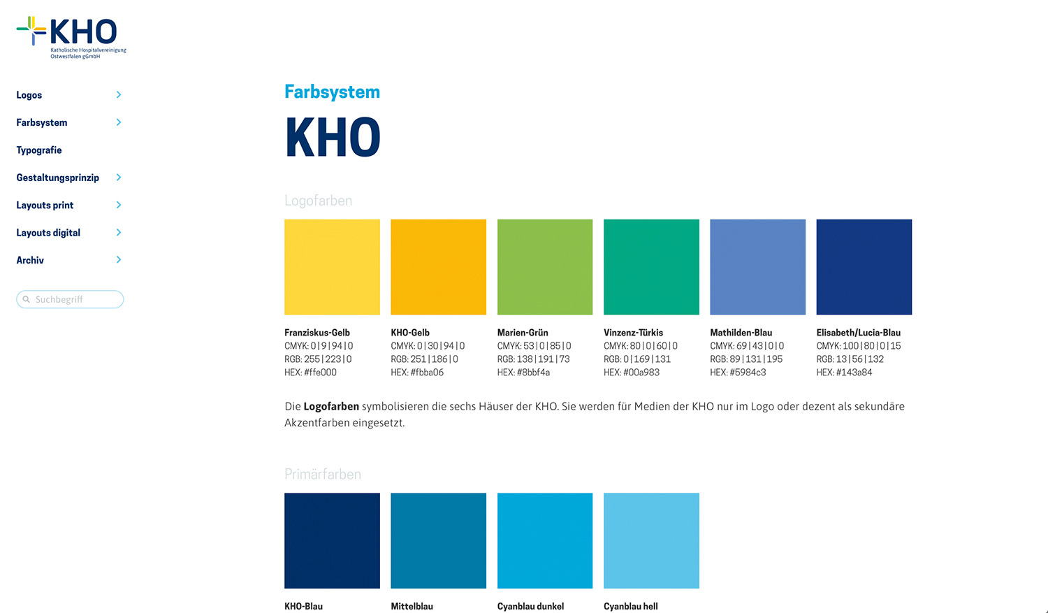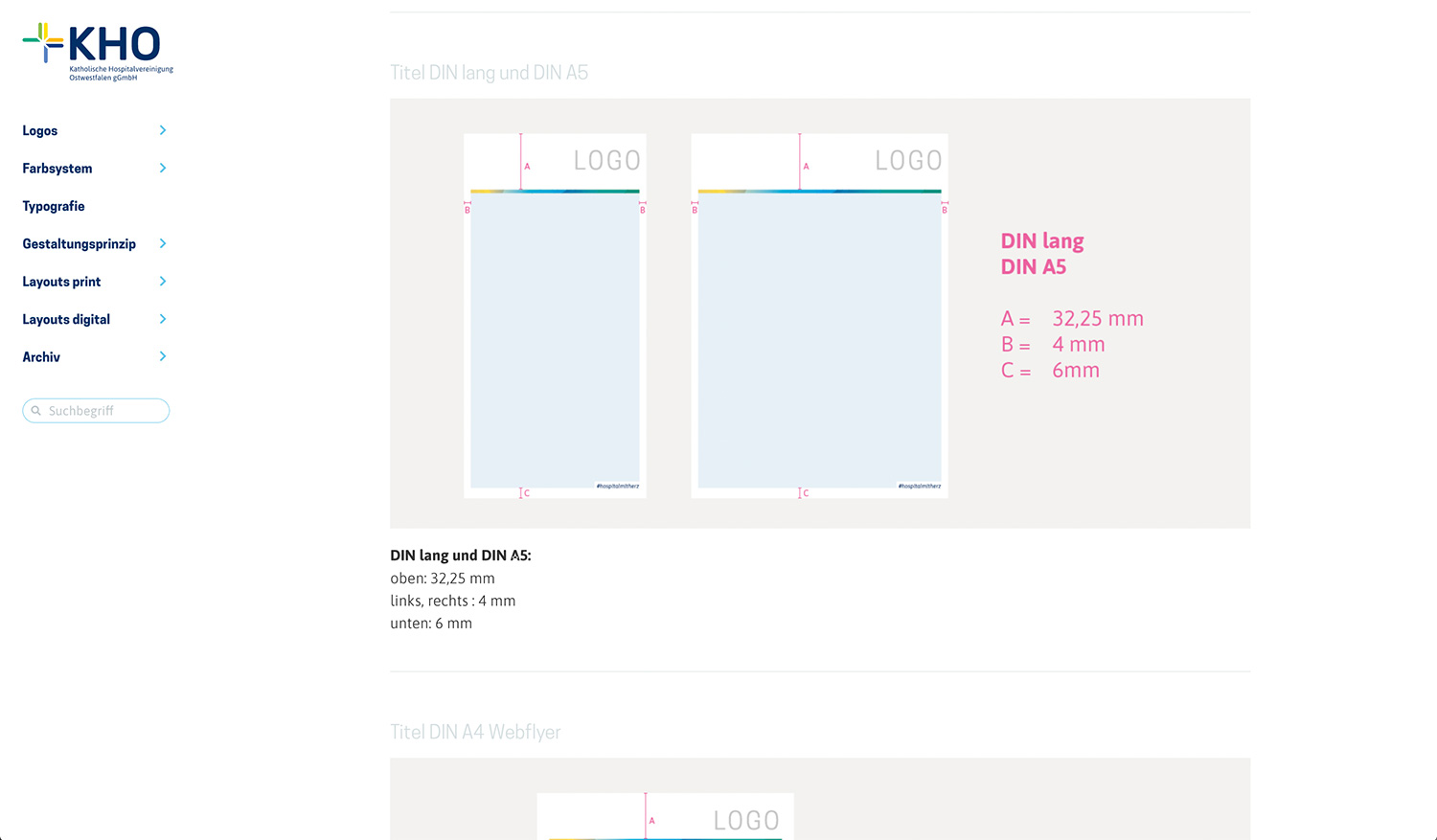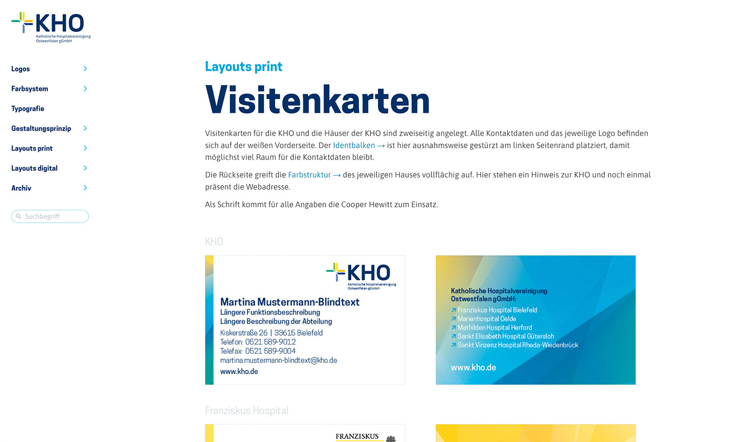 Das Cor­po­rate Design der KHO wird auf die Medien aller sechs Kran­ken­häuser ange­wendet. Die gestal­te­ri­schen Prin­zi­pien bleiben dabei ein­heit­lich – jedes Haus tritt jedoch in seinem eigenen Farb­klang und mit seinem indi­vi­du­ellen Logo auf.