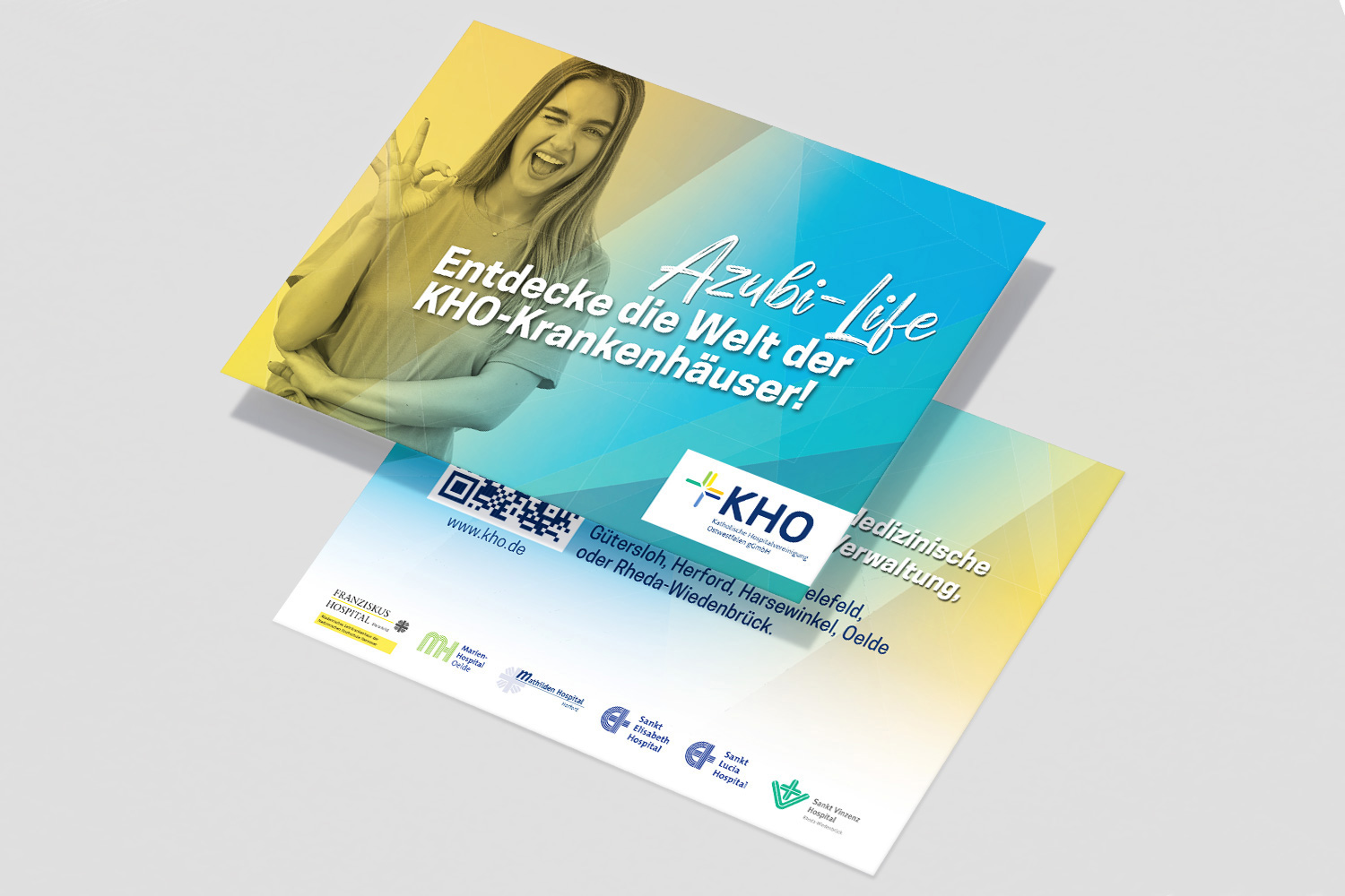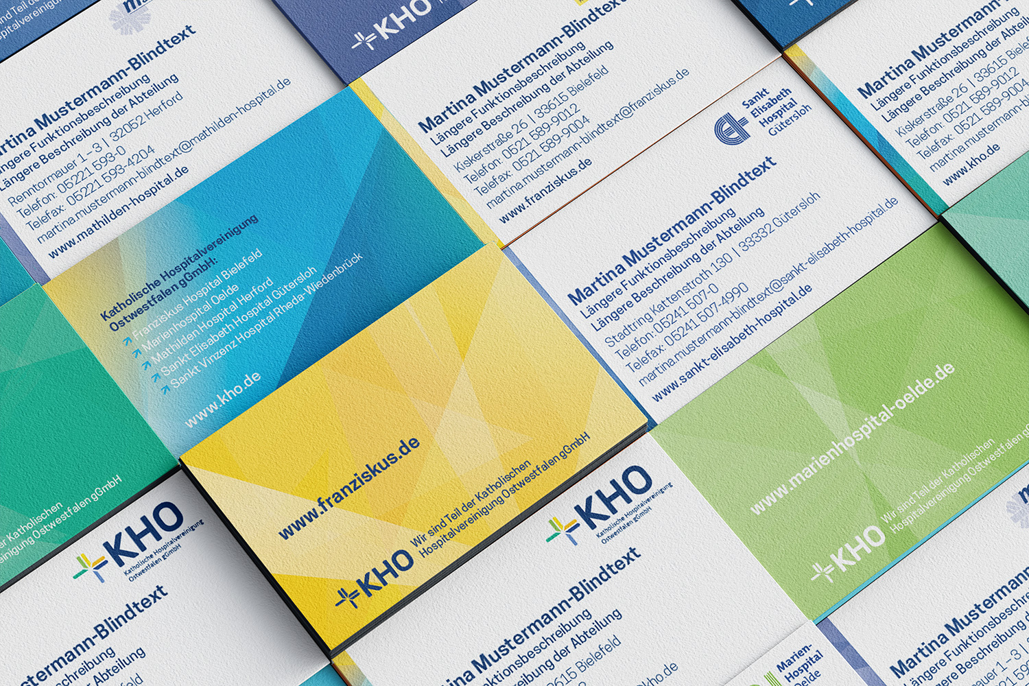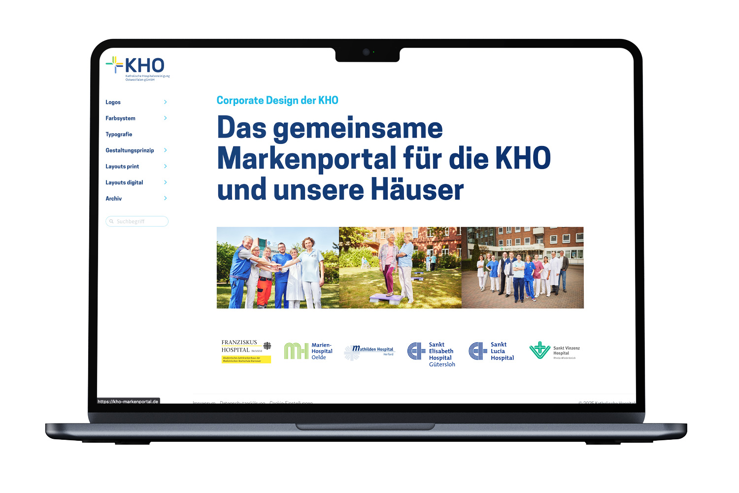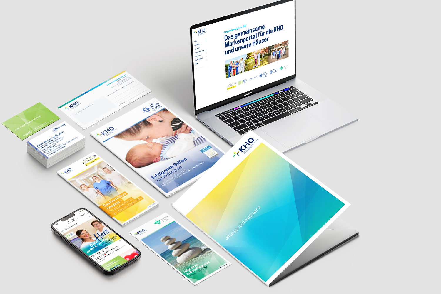 Die KHO ist ein Zusam­men­schluss von sechs Kran­ken­häu­sern in Ost­west­falen-Lippe. Jedes Haus tritt mit eigenem Namen und Logo auf, wäh­rend ein ein­heit­li­ches Cor­po­rate Design die gemein­same Zuge­hö­rig­keit sichtbar macht. Gleich­zeitig ist das Gestal­tungs­system so fle­xibel ange­legt, dass es sich an unter­schied­liche Medien und Anlässe anpassen lässt, ohne uni­form zu wirken.