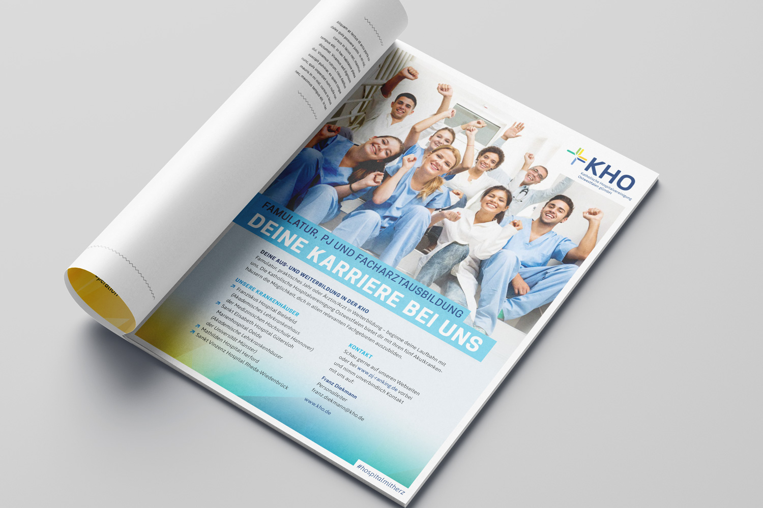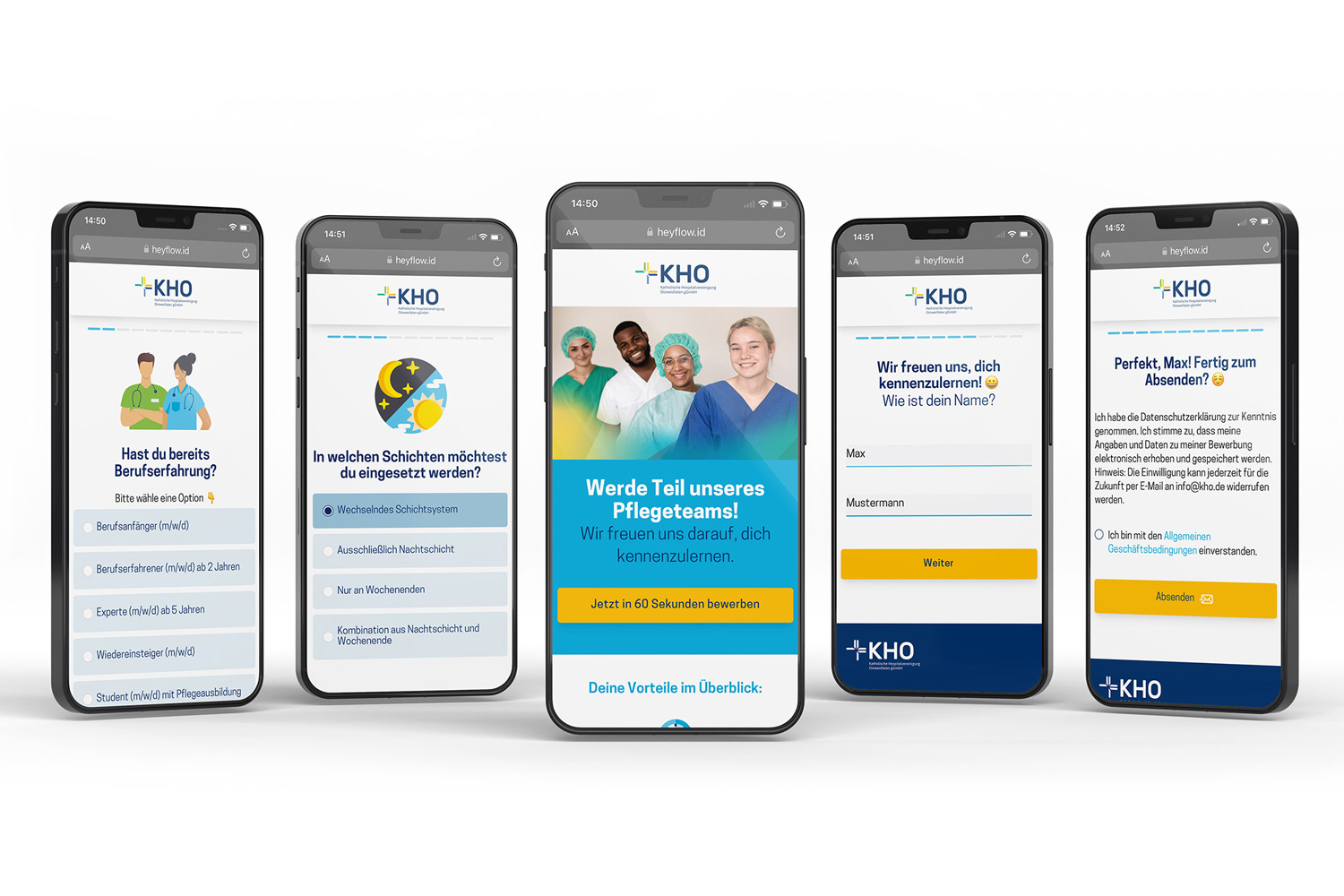 Ein zen­traler Bestand­teil der Kom­mu­ni­ka­tion der KHO ist das Recrui­ting von Fach­per­sonal. Neben klas­si­schen Wer­be­mit­teln für Fach­messen spielt auch das Social Recrui­ting eine wich­tige Rolle. Dafür habe ich Crea­tives, eine Landing­page sowie einen Bewer­bungs­funnel ent­wi­ckelt.