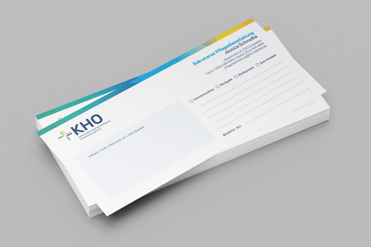 Mappen, Blöcke, Kurz­briefe, Vis­ten­karten, Gruß­karten, Pla­kate, Web­flyer oder Anzeigen – das Cor­po­rate Design der KHO wird auf alle Medien ange­wendet.