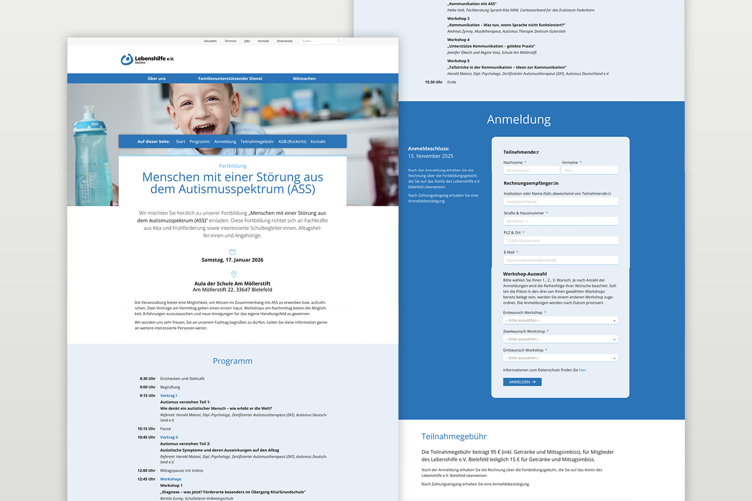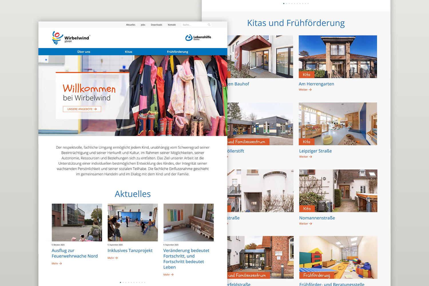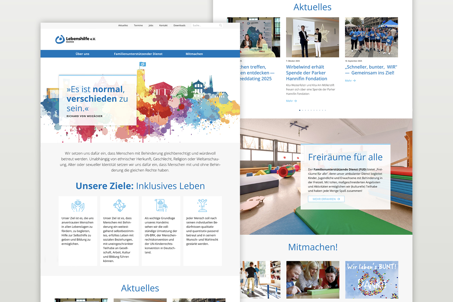 Die Lebenshilfe Bielefeld benötigte für den Verein sowie für ihr Kita- und Schulangebot ein Website-Konzept, das sowohl die Zusammengehörigkeit der Bereiche verdeutlicht als auch ausreichend Flexibilität für unterschiedliche Inhalte bietet. Meine Aufgabe umfasste neben der Konzeption und dem Design auch die technische Umsetzung mit WordPress und Elementor.