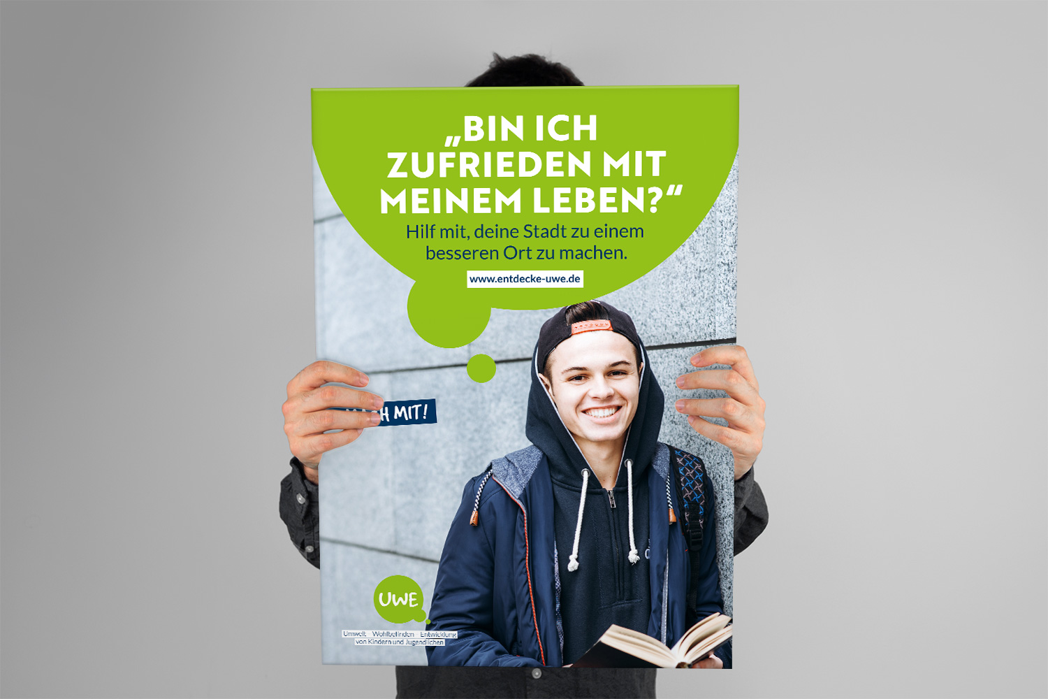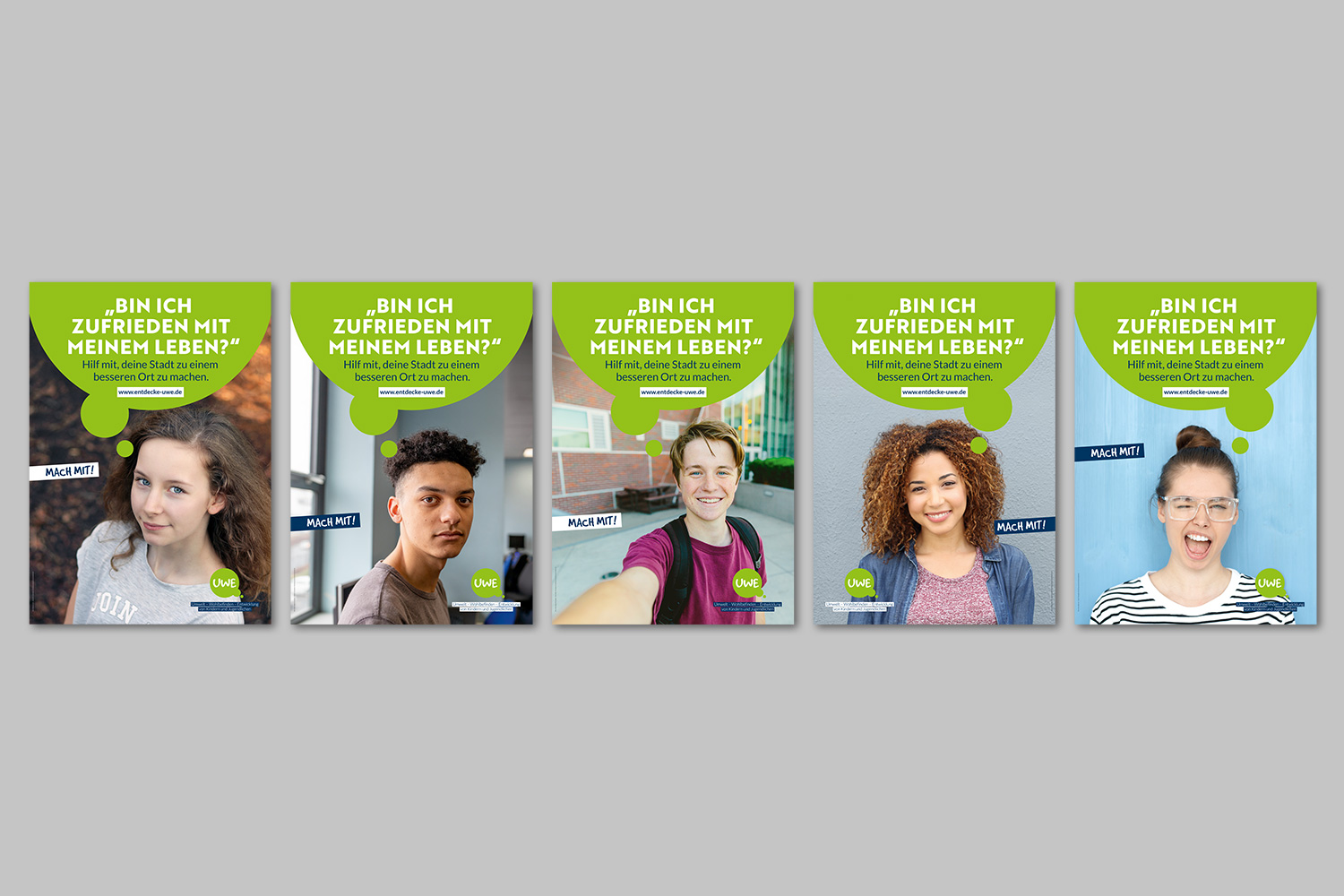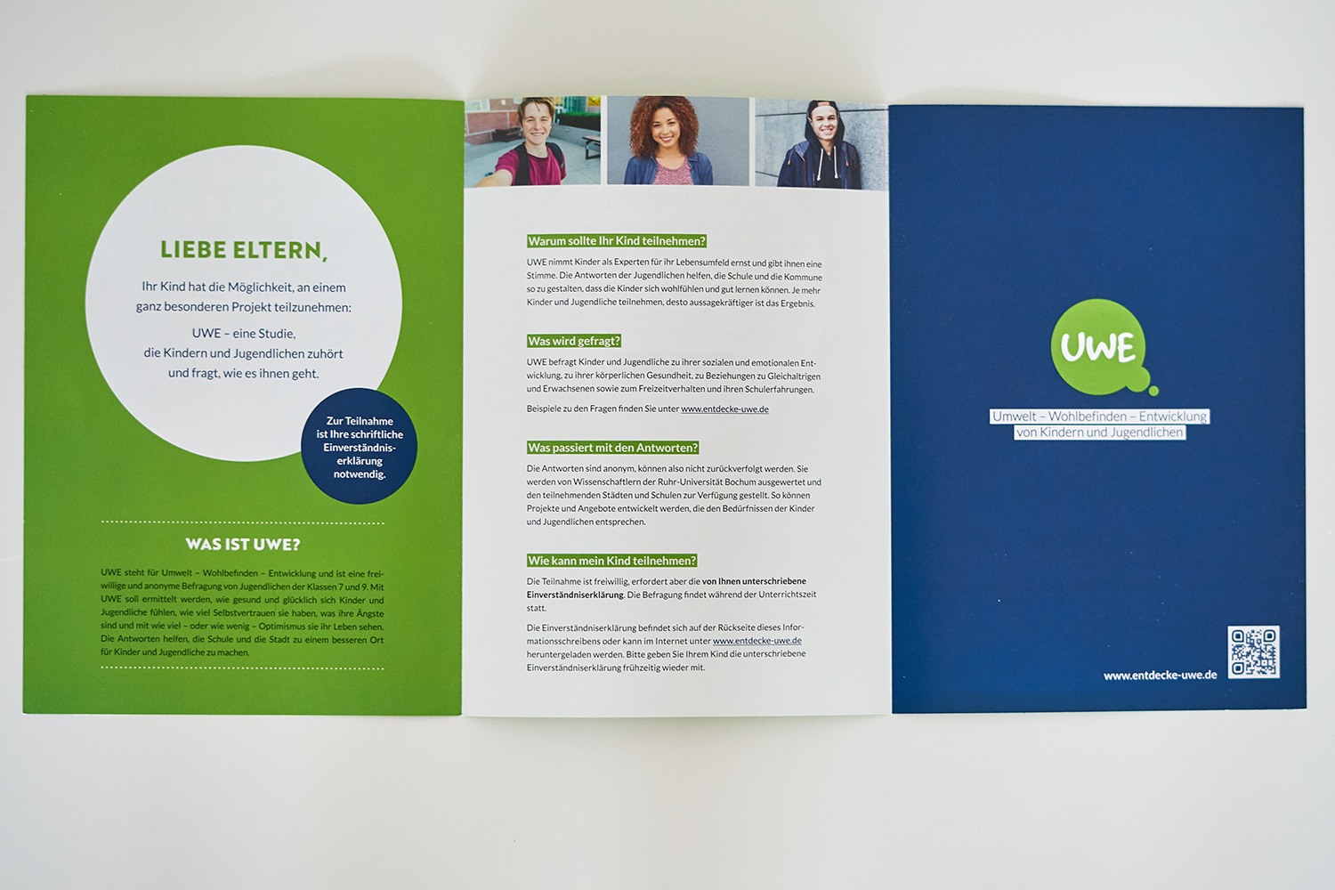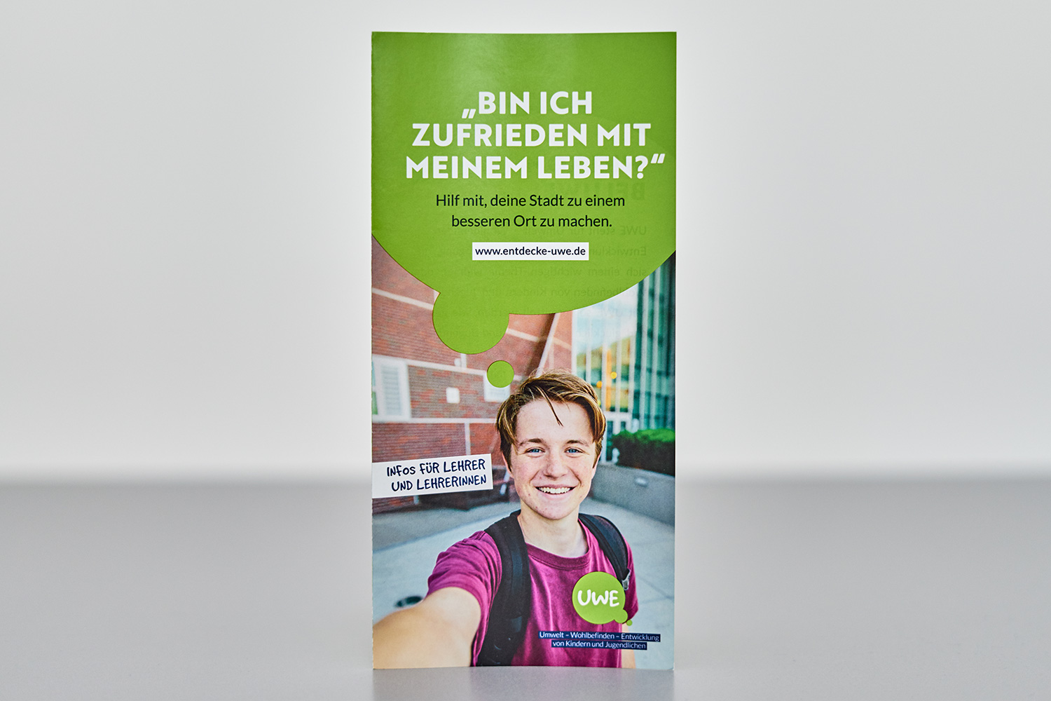 UWE steht für »Umwelt, Wohl­be­finden und Ent­wick­lung« von Kin­dern und Jugend­li­chen. Um Städte und Kom­munen für Kinder und Jugend­liche lebens­werter zu gestalten, werden diese ein­ge­laden, sich an einer Befra­gung zu betei­ligen. Die Auf­gabe für dieses Gemein­schafts­pro­jekt war, ein Logo und ein Design­kon­zept zu ent­wi­ckeln, das sowohl Schüler:innen als auch Lehrer:innen und Eltern anspricht.