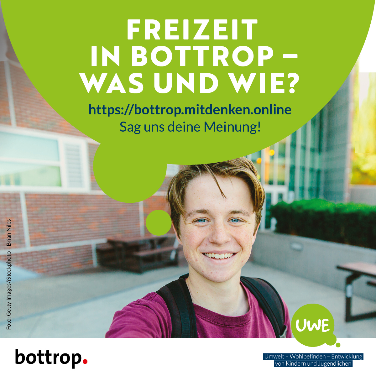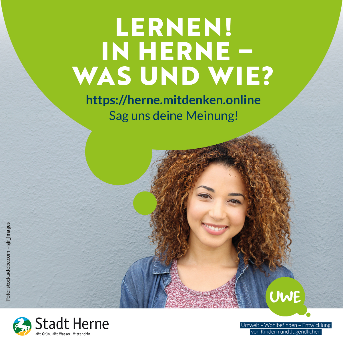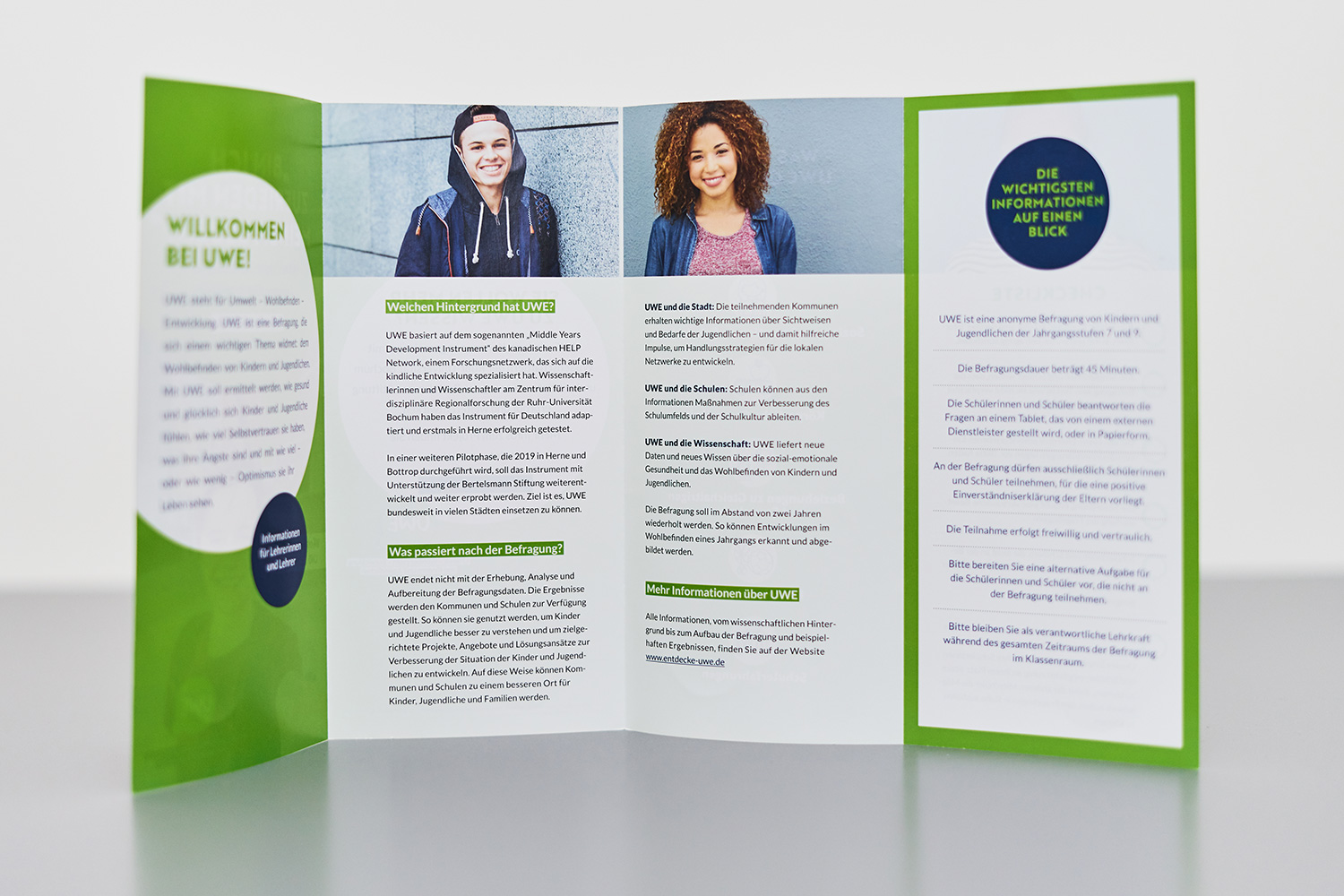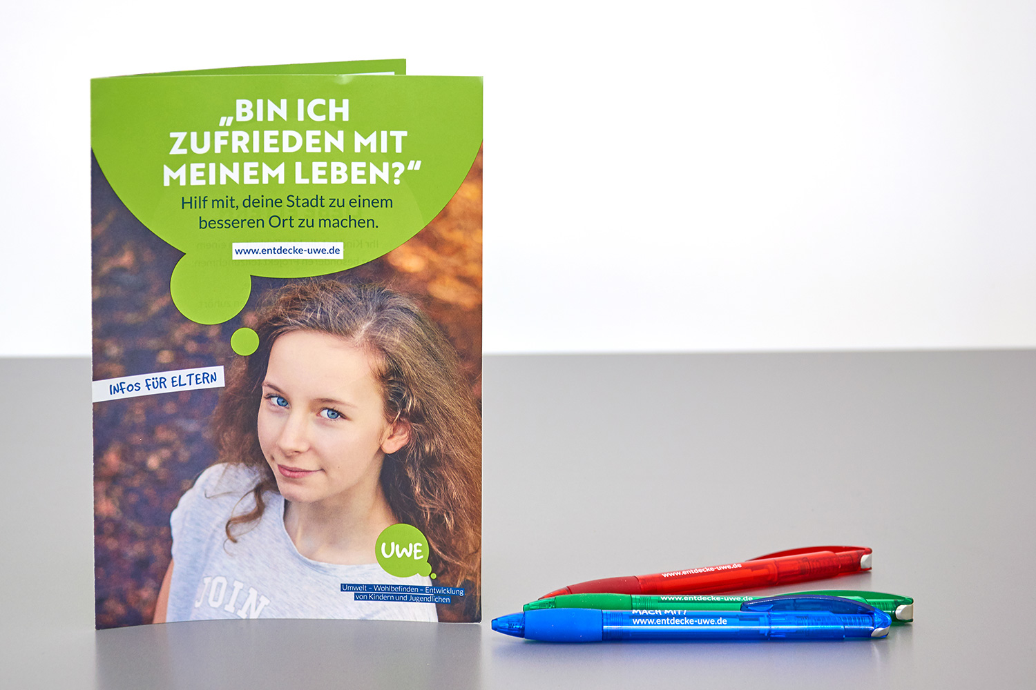 UWE steht für »Umwelt, Wohl­be­finden und Ent­wick­lung« von Kin­dern und Jugend­li­chen. Um Städte und Kom­munen für Kinder und Jugend­liche lebens­werter zu gestalten, werden diese ein­ge­laden, sich an einer Befra­gung zu betei­ligen. Die Auf­gabe für dieses Gemein­schafts­pro­jekt war, ein Logo und ein Design­kon­zept zu ent­wi­ckeln, das sowohl Schüler:innen als auch Lehrer:innen und Eltern anspricht.